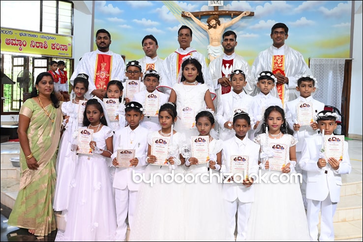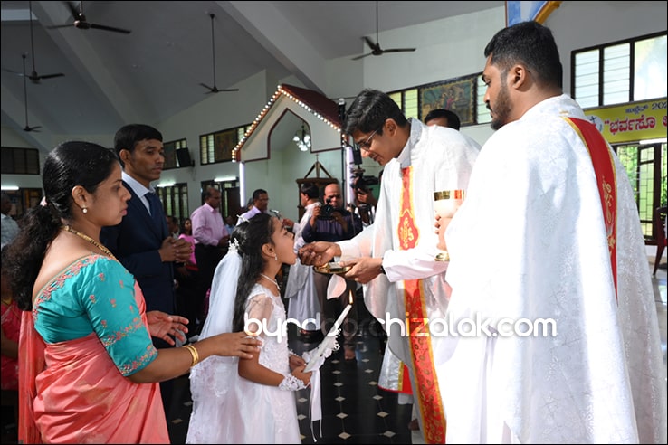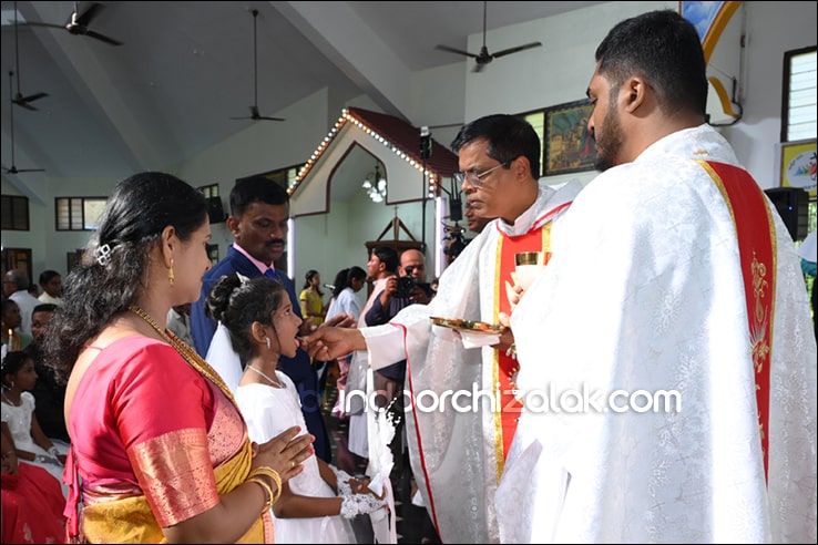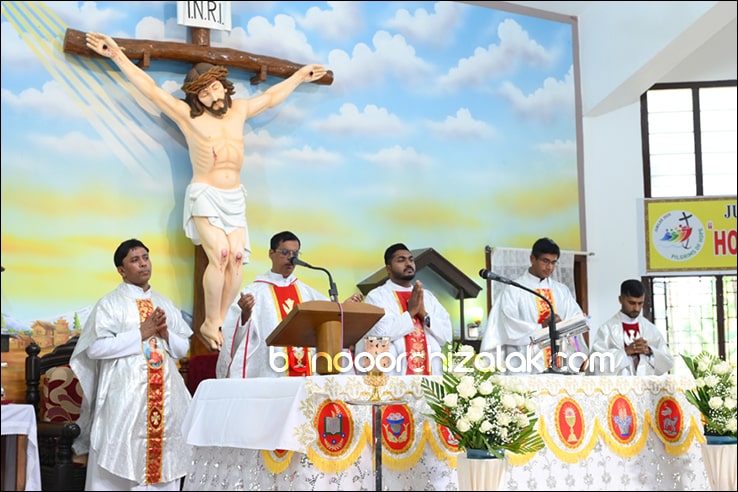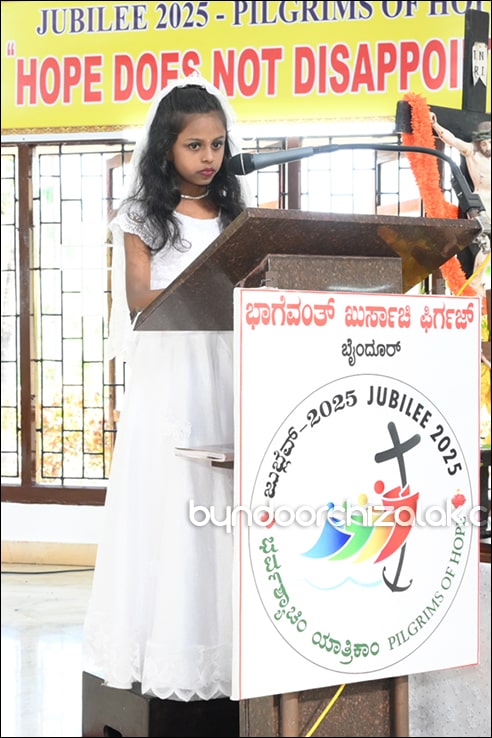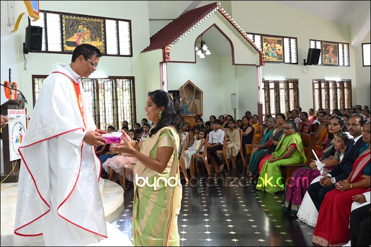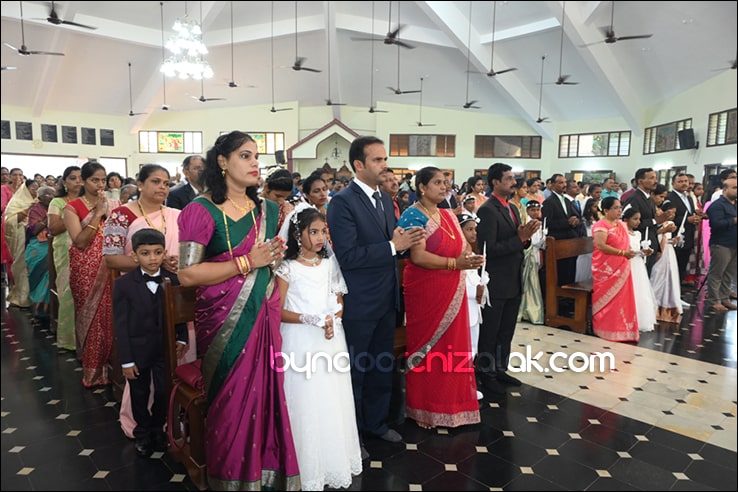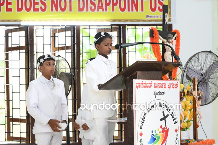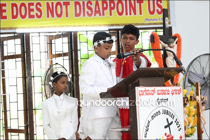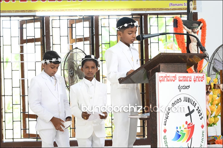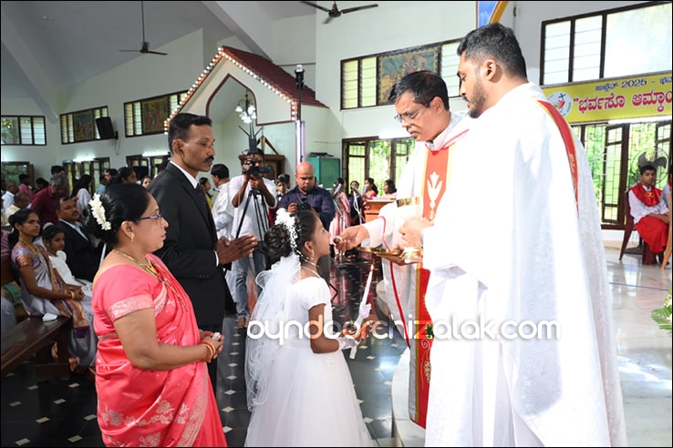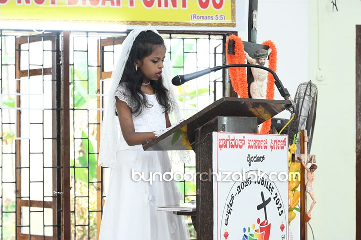 ಬೈಂದೂರ್: ಫಿರ್ಗಜೆಚಾ 15 ಭುರ್ಗ್ಯಾಂನಿ ವ್ಹಡಾ ಉಲ್ಲಾಸಾನ್ ಆಪ್ಲ್ಯಾ ಪಯ್ಲ್ಯಾ ಕುಮ್ಗಾರಾಚೊ ಸಂಭ್ರಮ್ ಆಚರಣ್ ಕೆಲೊ. ಆಜ್ ಸಕಾಳಿಂ ಚಲ್ಲ್ಲ್ಯಾ ಸಂಭ್ರಮೀಕ್ ಮೀಸಾಂತ್ ಪಯ್ಲೊ ಕುಮ್ಗಾರ್ ಸೆಂವ್ಚ್ಯಾ ಭುರ್ಗ್ಯಾಂನಿ ಆಪ್ಲ್ಯಾ ಆವಯ್-ಬಾಪಯ್ ಸಾಂಗಾತಾ ಪ್ರವೇಶ್ ಜಾವ್ನ್ ವಿಗಾರ್ ಬಾ| ವಿನ್ಸೆಂಟ್ ಕುವೆಲ್ಲೊ, ಬಾ| ಮೈಕೆಲ್ ಡಾಯಸ್, ಬಾ| ರೊಯಲ್ ನಜ್ರೆತ್, ಬಾ|ಕಿರಣ್ ನಜ್ರೆತ್ ಆನಿ ಸಹಾಯಕ್ ವಿಗಾರ್ ಬಾ| ಫೃಥ್ವಿ ರೊಡ್ರಿಗಸಾ ಸಾಂಗಾತಾ ಸಂಭ್ರಮೀಕ್ ಮೀಸಾಚೆ ಬಲಿದಾನ್ ಭೆಟಯ್ಲೆಂ.